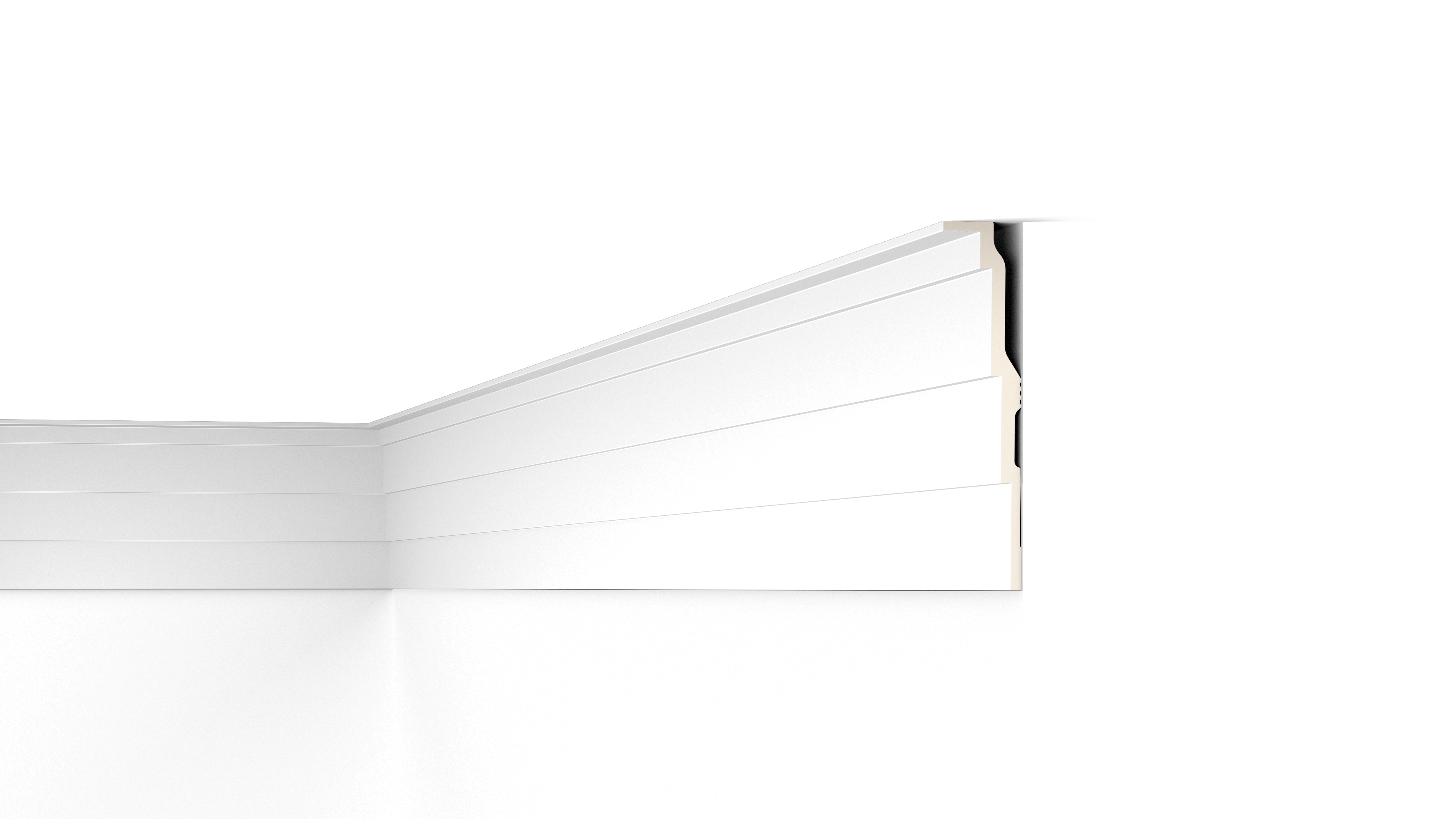 Mit direkter oder indirekter Beleuchtung kombinierbare Decken-, Wand- und Sockelleisten sowie Wanddekoraktionselemente.