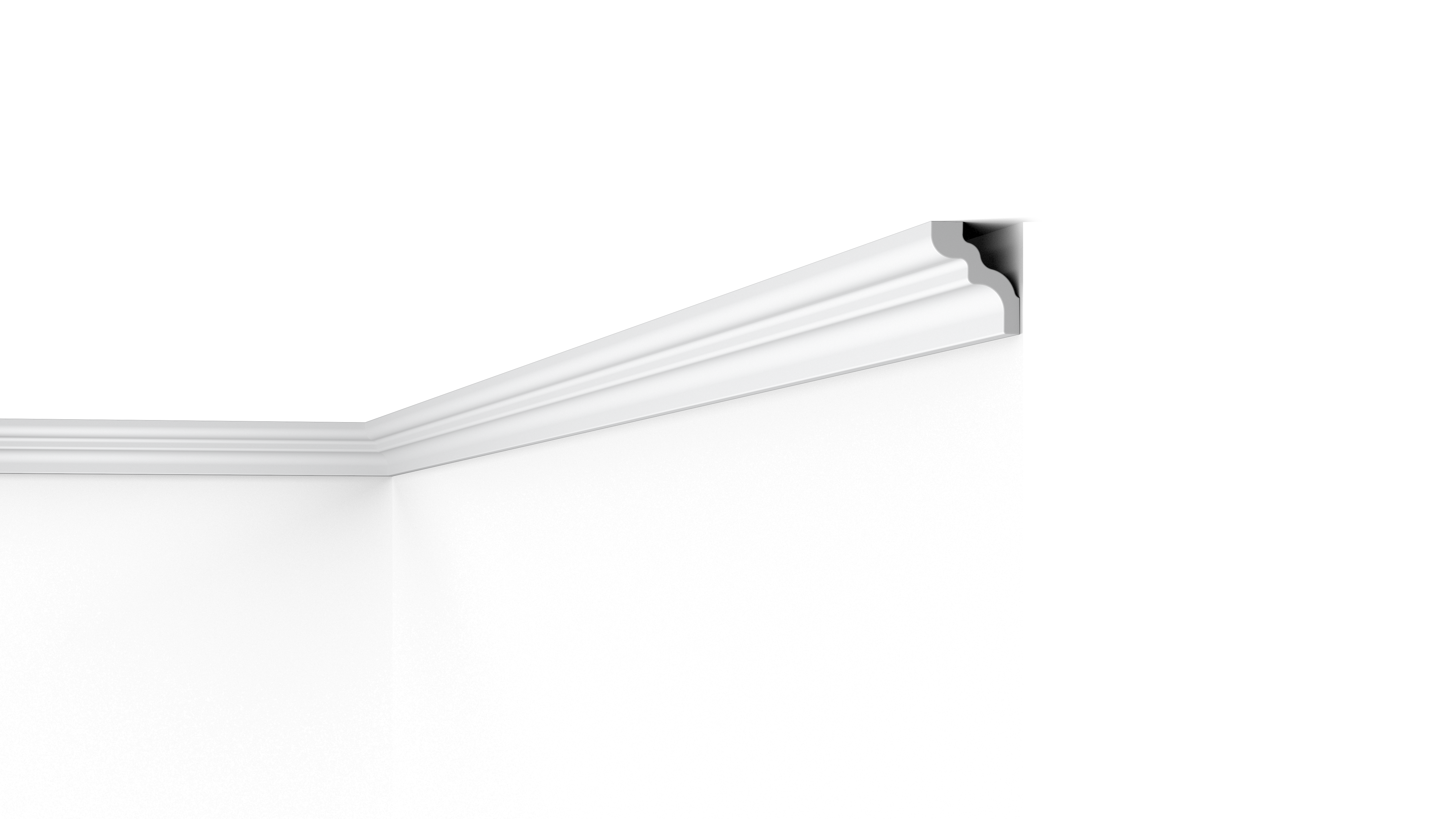 Polystyrol ist wasserfest, was die D NOMASTYL® Deckenleiste ideal für Badezimmer und Küchen macht. Die Montage der Leisten wird durch das geringe Gewicht erleichtert. Darüber hinaus bietet die Deckenleiste Platz, kleinere Kabel und Risse zu verdecken.