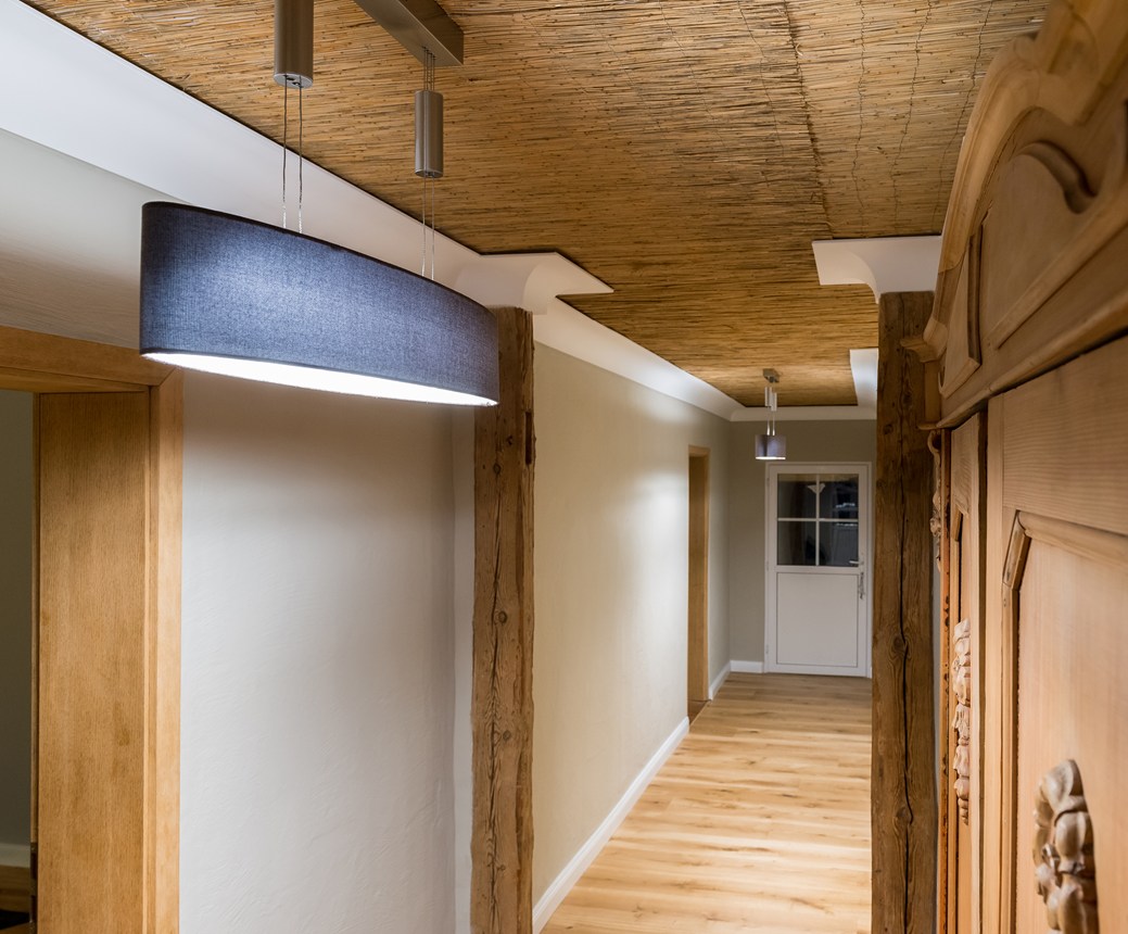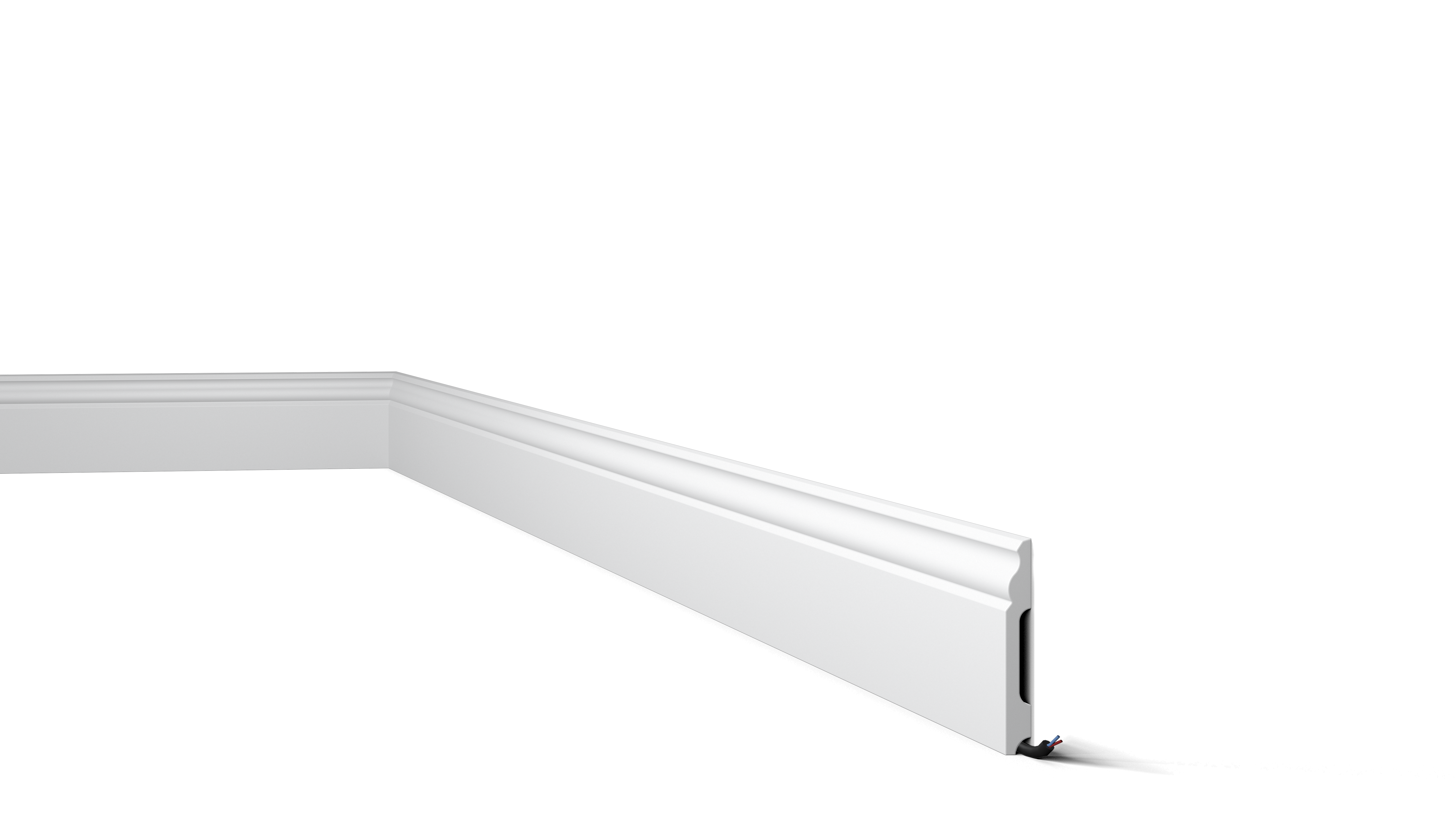 Mit direkter oder indirekter Beleuchtung kombinierbare Decken-, Wand- und Sockelleisten sowie Wanddekoraktionselemente.
