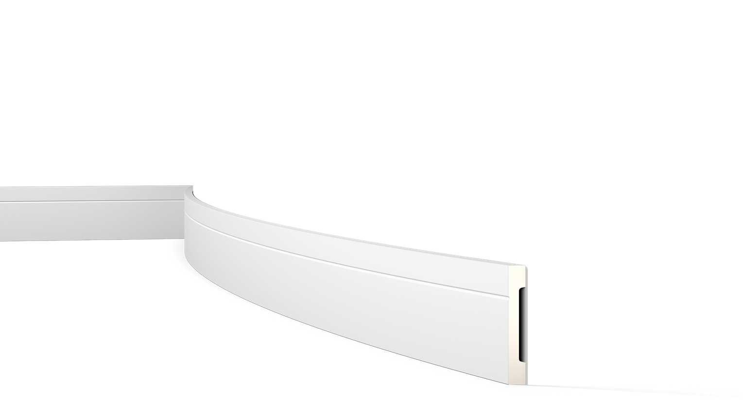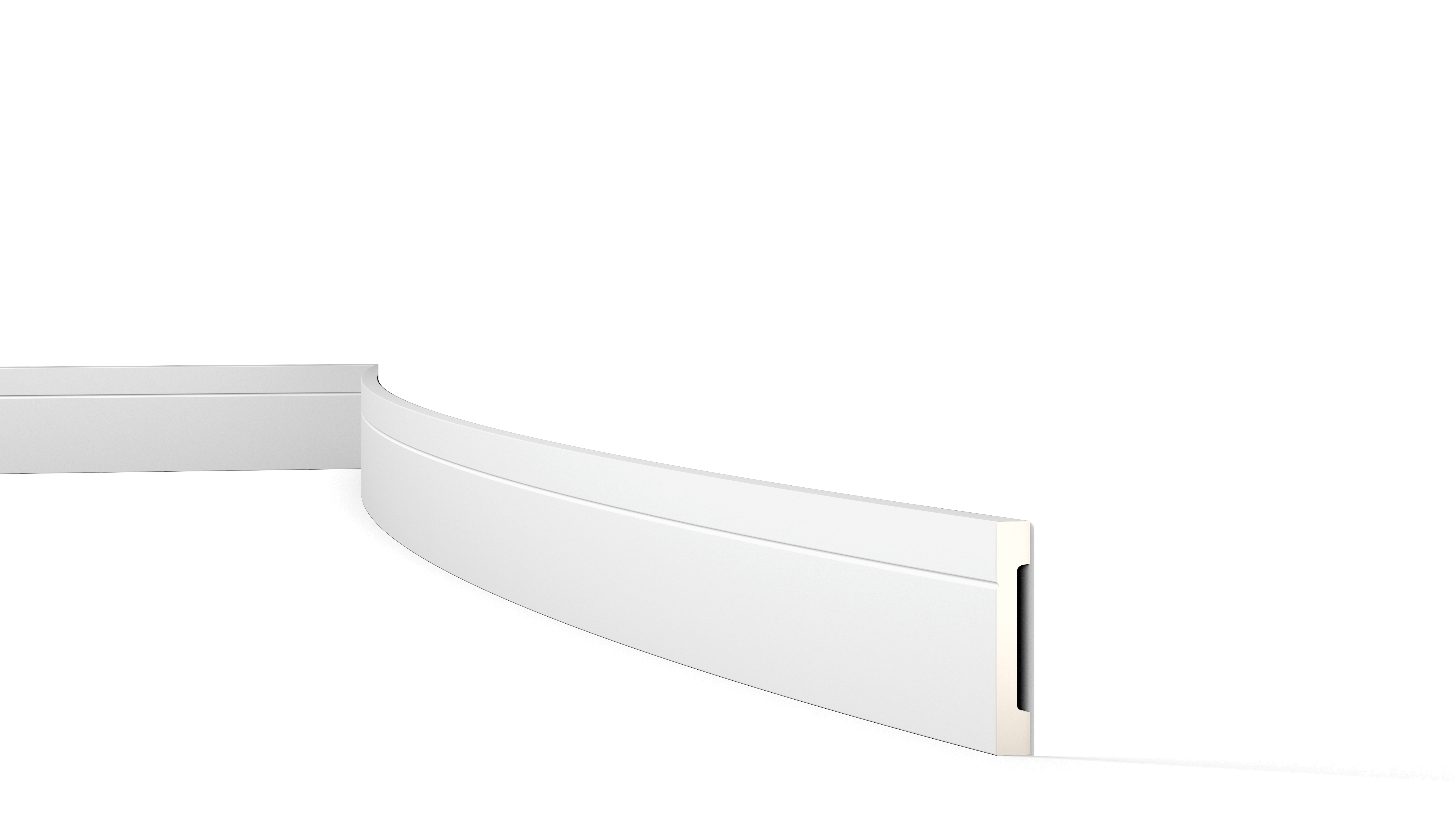 Die FD2 FLEX wurde speziell für die Form einer gebogenen Wand entwickelt. Das Design der FD2 FLEX Sockelleiste ist mit einer Aussparung auf der Rückseite versehen, um Kabel zu verbergen, sodass ein makelloses Endergebnis erzielt wird. Das Profil lässt sich einfach mit ADEFIX® PLUS-Kleber anbringen und wird grundiert und damit anstrichfertig geliefert.