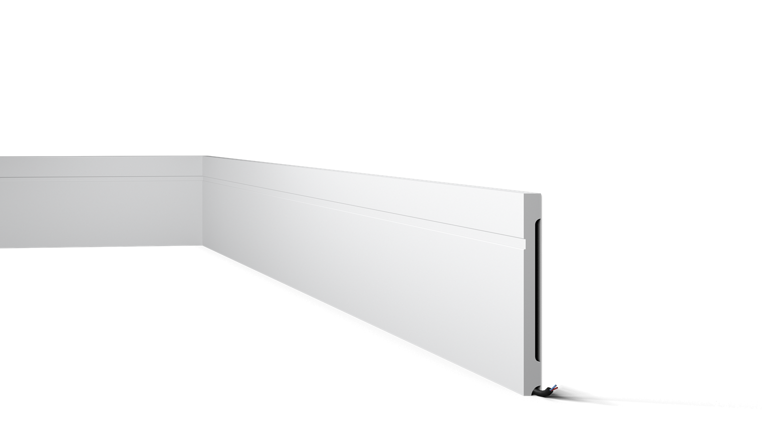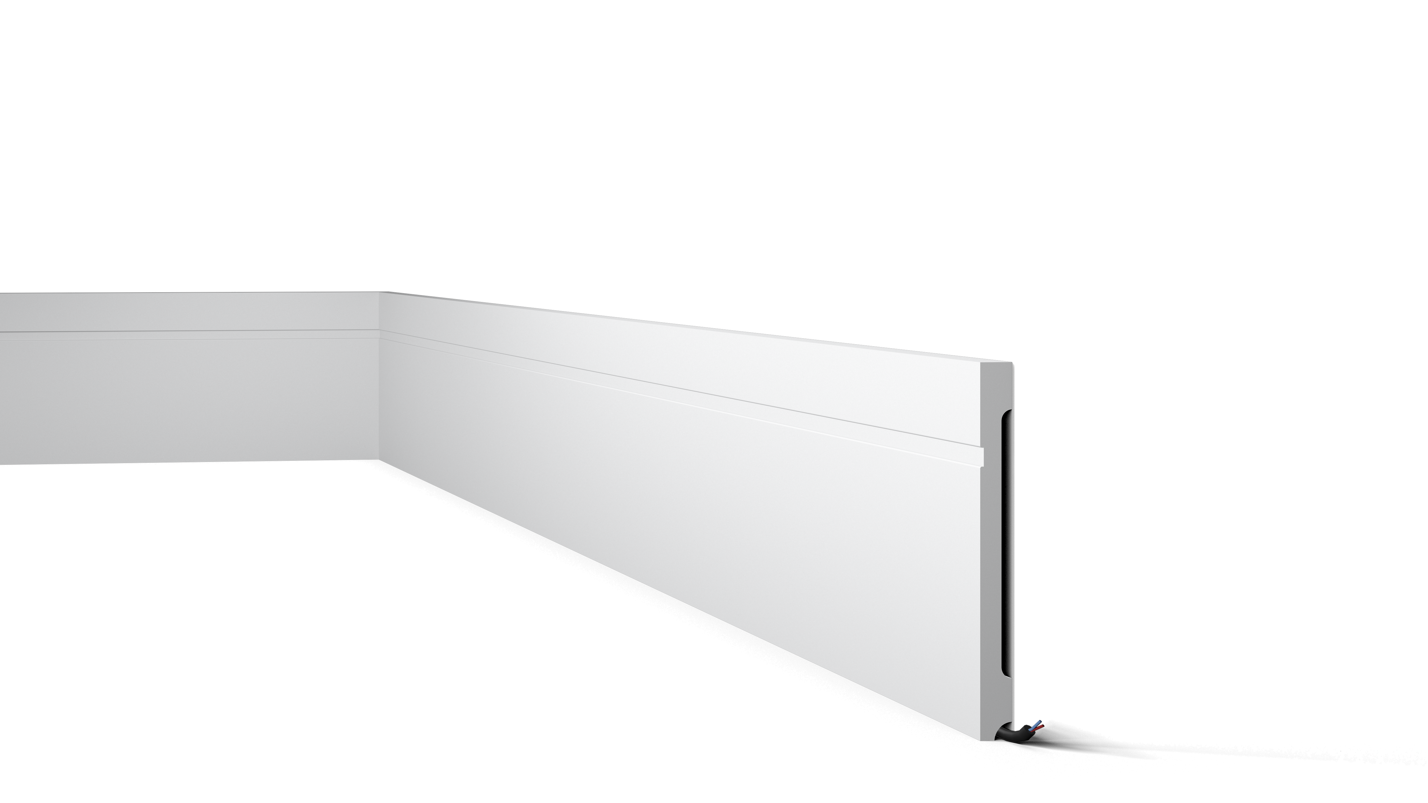 Mit direkter oder indirekter Beleuchtung kombinierbare Decken-, Wand- und Sockelleisten sowie Wanddekoraktionselemente.