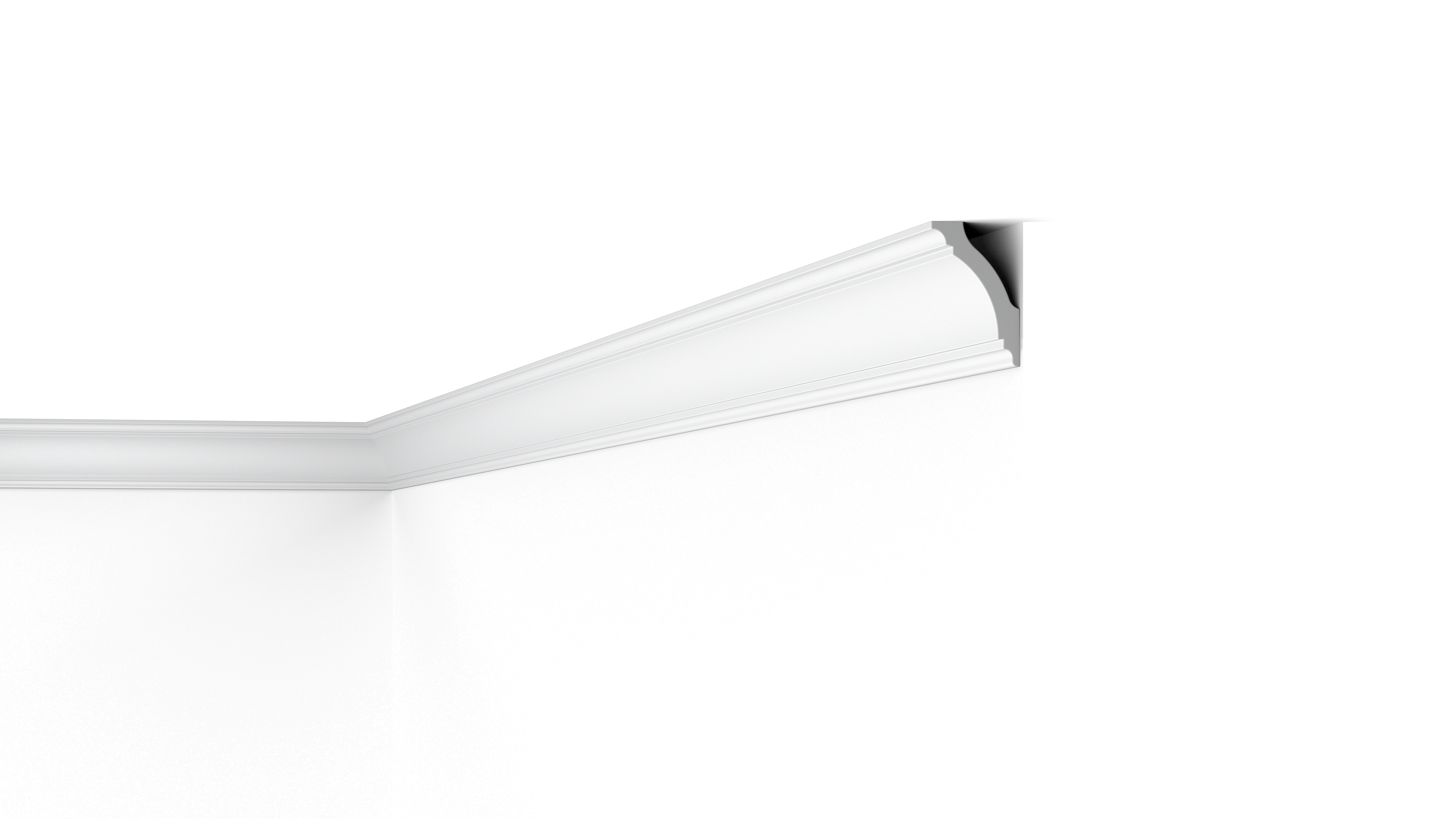 Entscheiden Sie sich für eine stilvolle und dennoch schlichte Deckenleiste wie die GK NOMASTYL®, um ein dezentes Element zu erhalten. Das leicht geschwungene Profil mit linearen Details verleiht dem Raum Struktur und Spannung, ohne ihn zu dominieren.