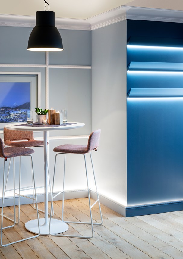 Die IL2 ARSTYL® bietet genügend Raum, um auf ihrer Rückseite ein LED-Band zu platzieren. Somit wird die Deckenleiste zur indirekten Lichtquelle und trägt zu einer positiven Raumatmosphäre bei. Außerdem lässt sie bequem Kabel oder Risse verschwinden.