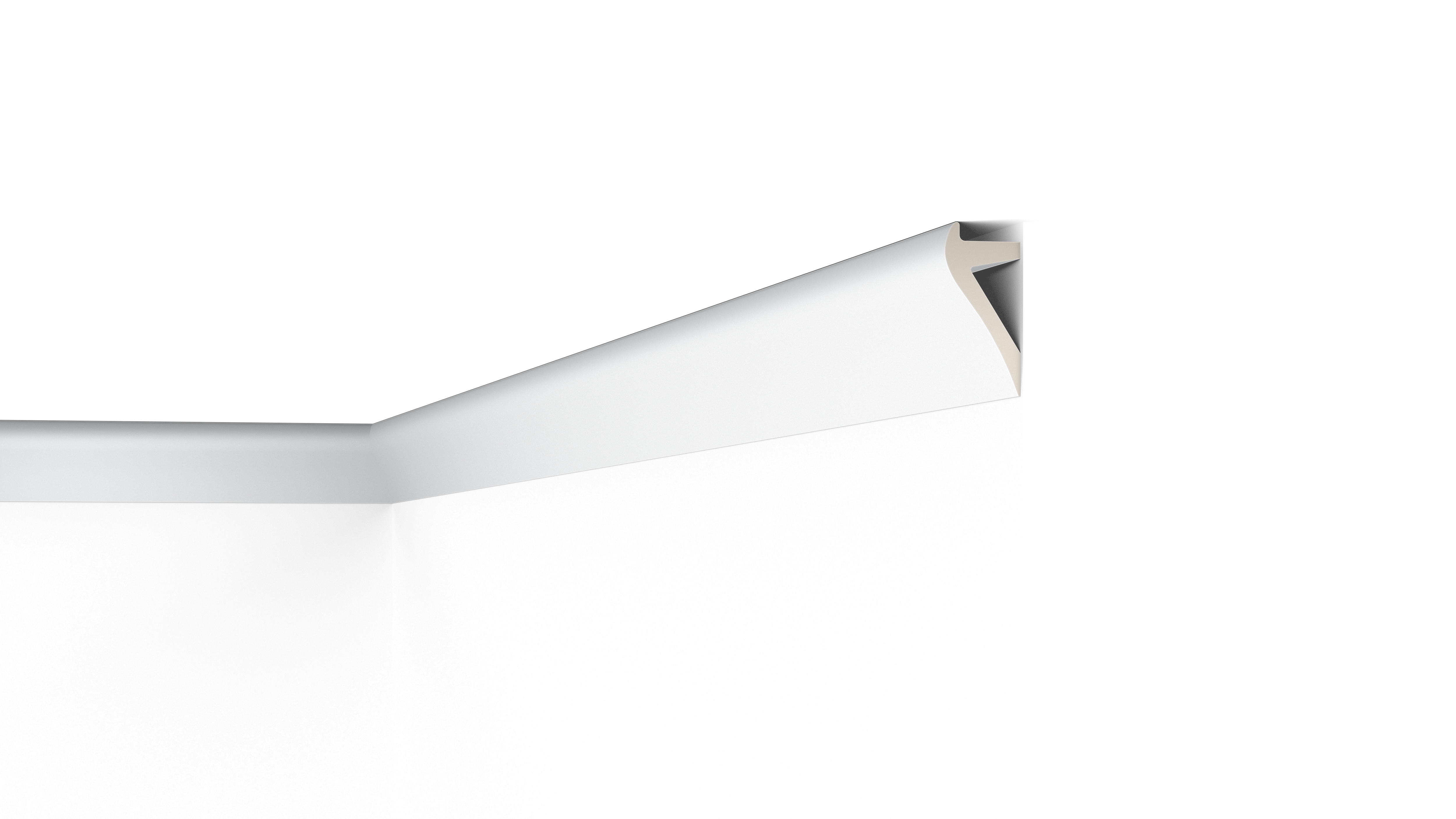Mit direkter oder indirekter Beleuchtung kombinierbare Decken-, Wand- und Sockelleisten sowie Wanddekoraktionselemente.