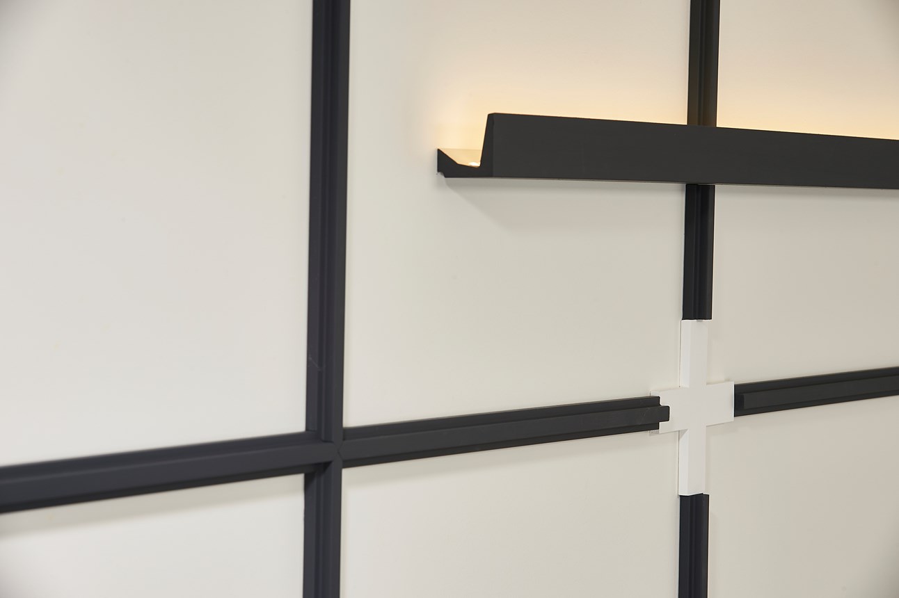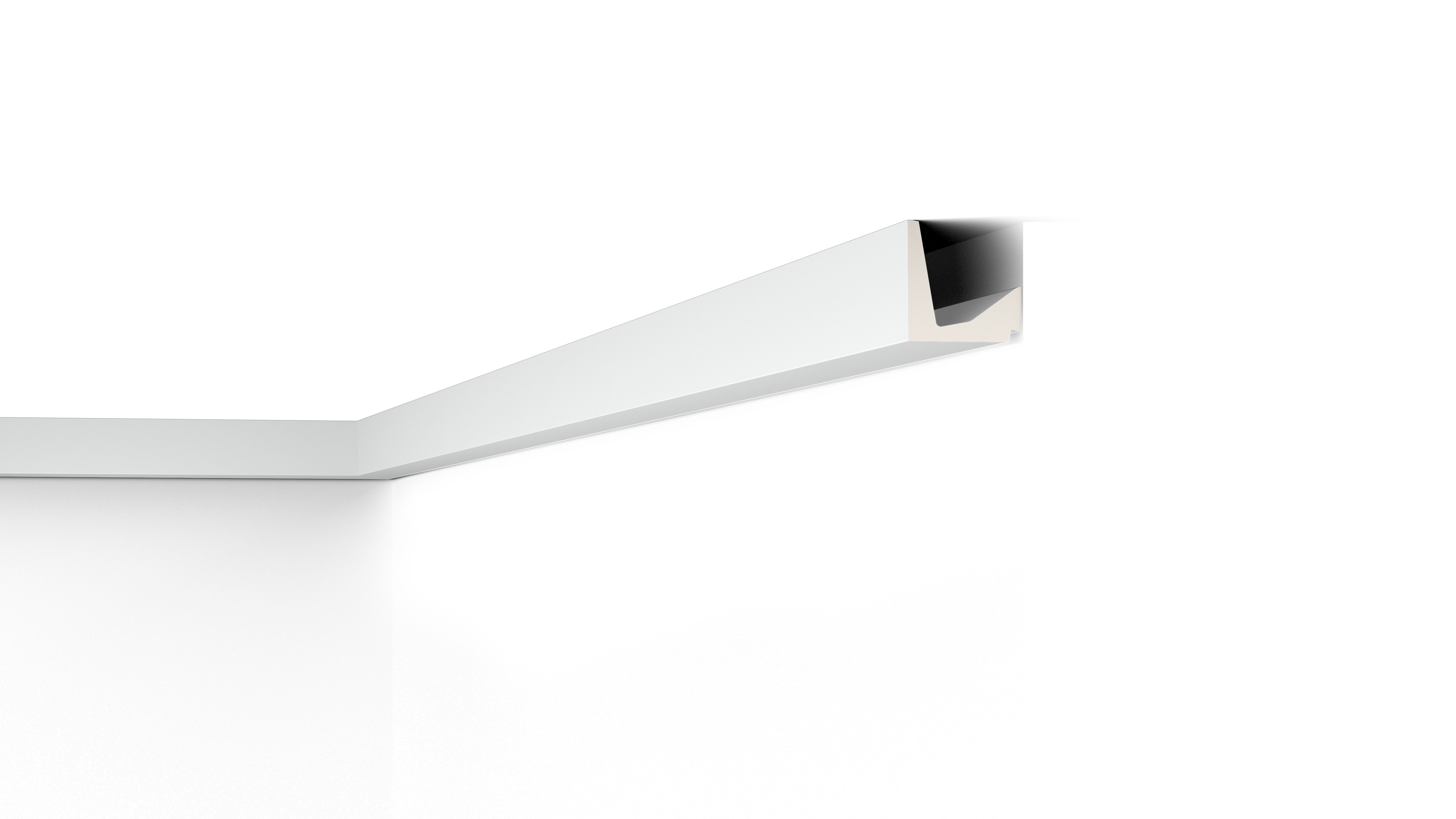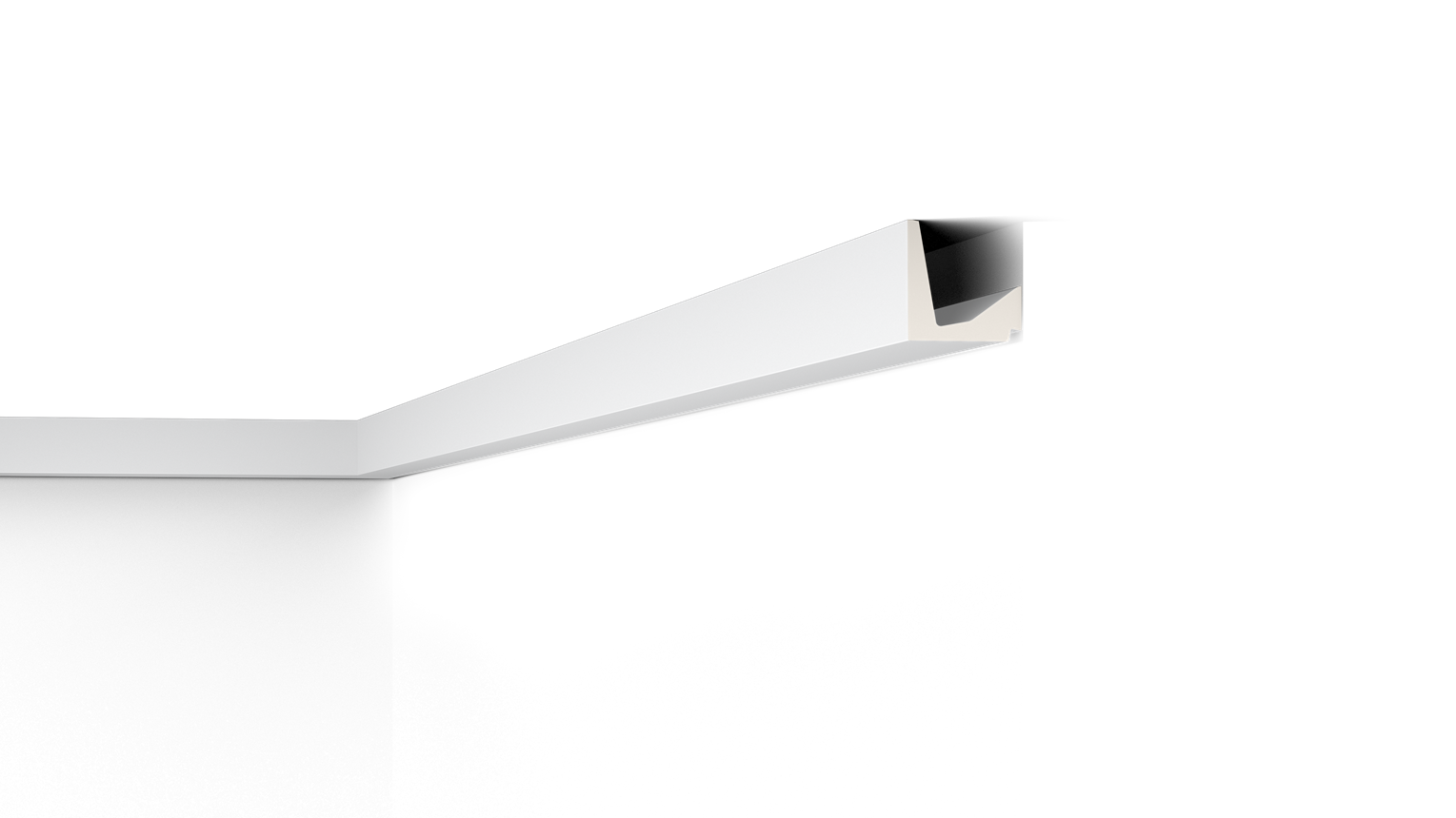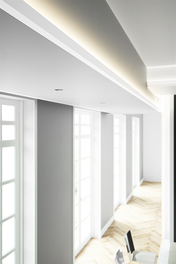 Mit direkter oder indirekter Beleuchtung kombinierbare Decken-, Wand- und Sockelleisten sowie Wanddekoraktionselemente.