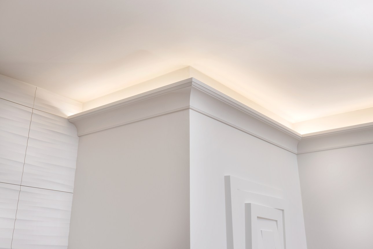 Mit direkter oder indirekter Beleuchtung kombinierbare Decken-, Wand- und Sockelleisten sowie Wanddekoraktionselemente.