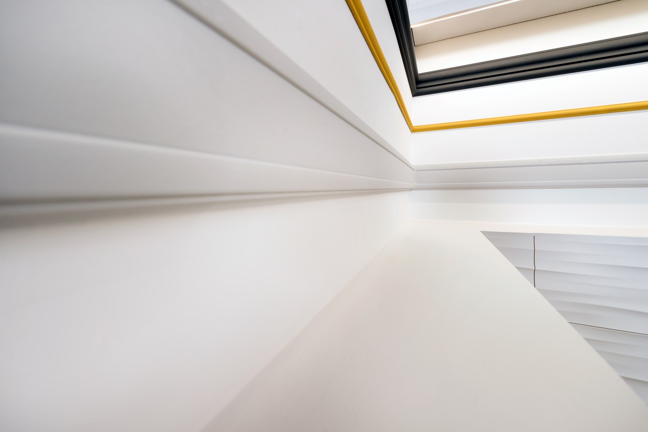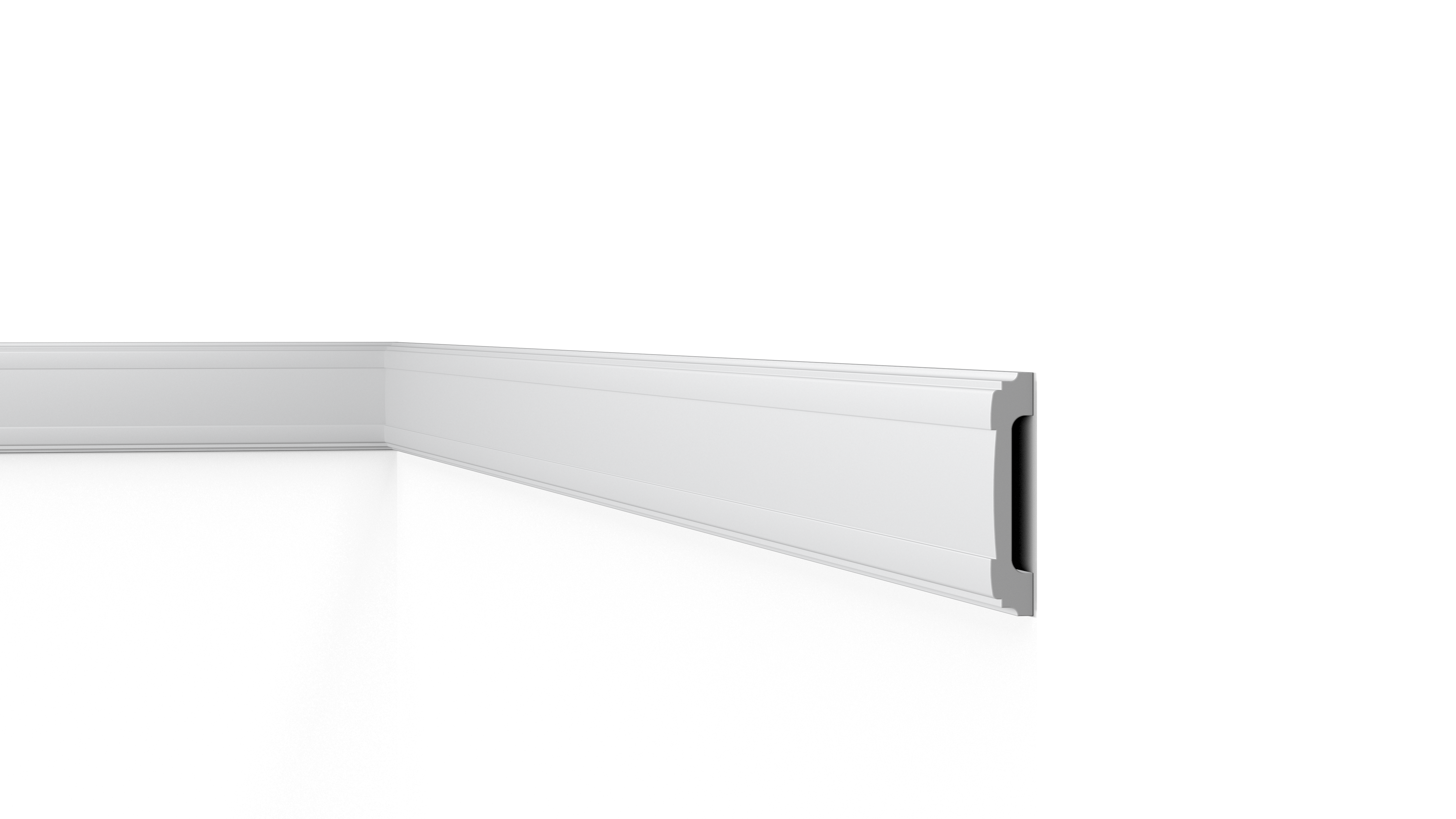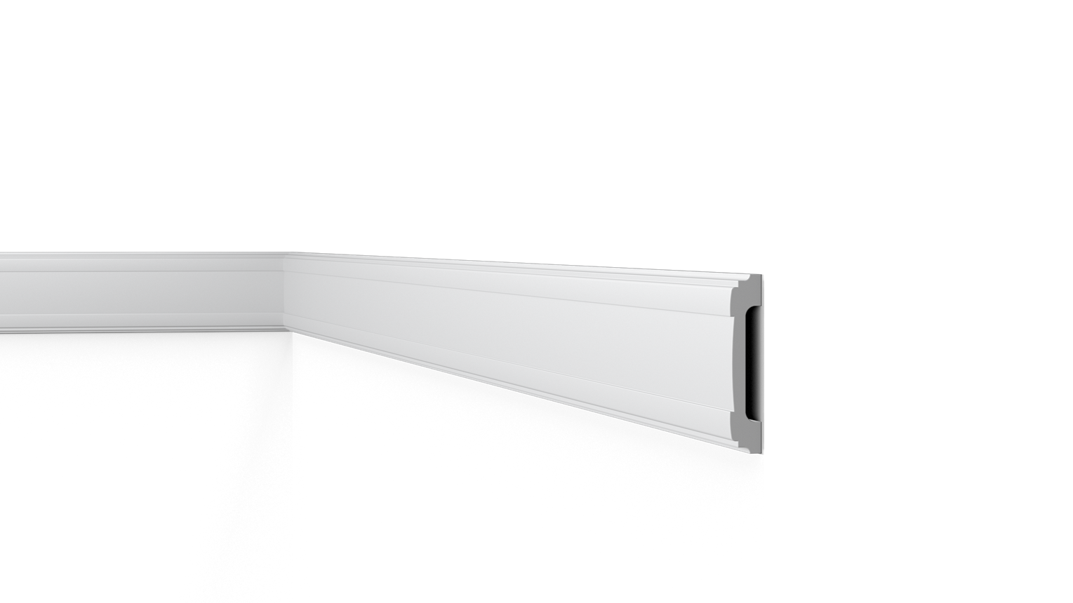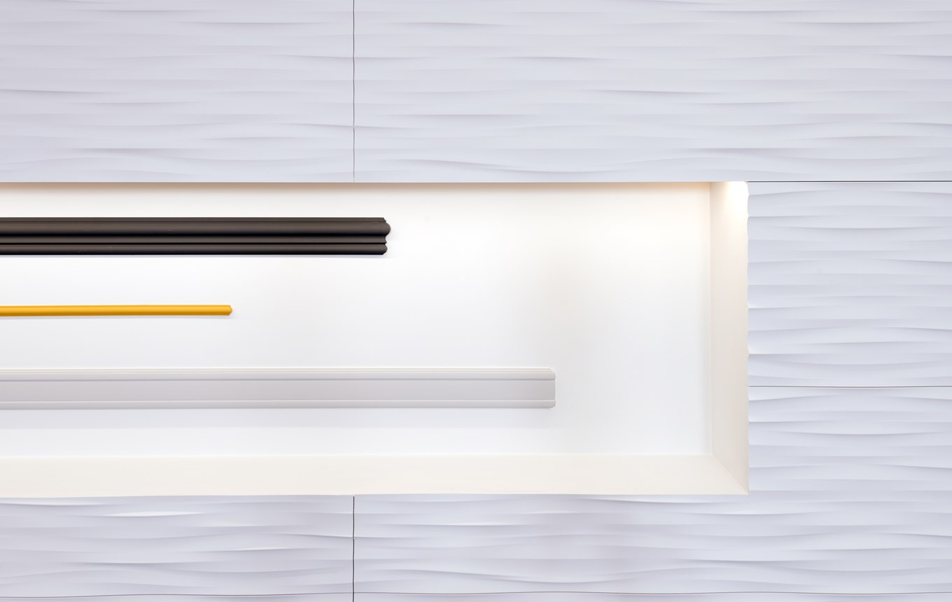 Mit direkter oder indirekter Beleuchtung kombinierbare Decken-, Wand- und Sockelleisten sowie Wanddekoraktionselemente.