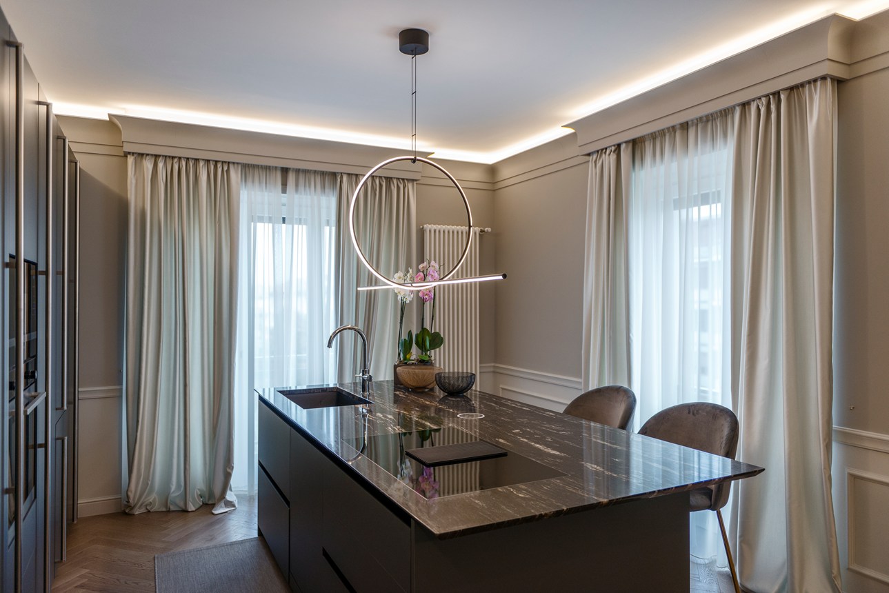 Mit direkter oder indirekter Beleuchtung kombinierbare Decken-, Wand- und Sockelleisten sowie Wanddekoraktionselemente.
