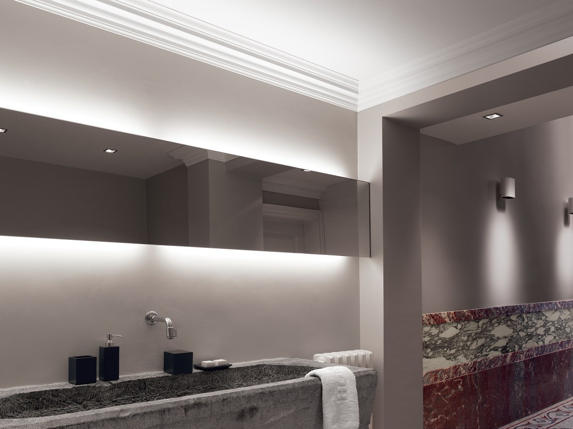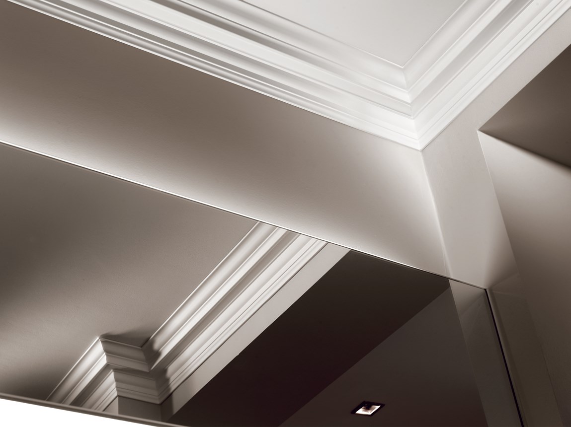 Mit direkter oder indirekter Beleuchtung kombinierbare Decken-, Wand- und Sockelleisten sowie Wanddekoraktionselemente.