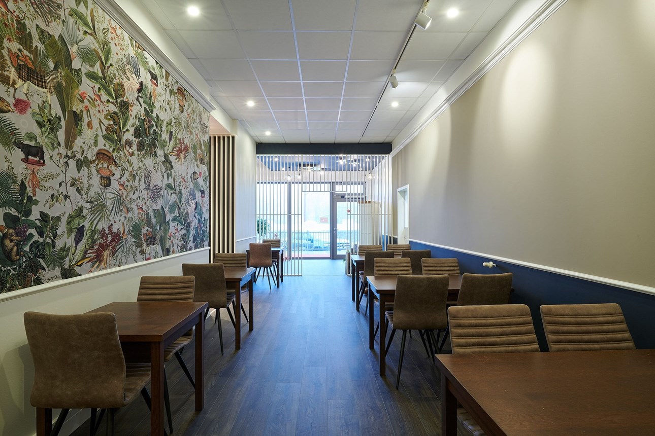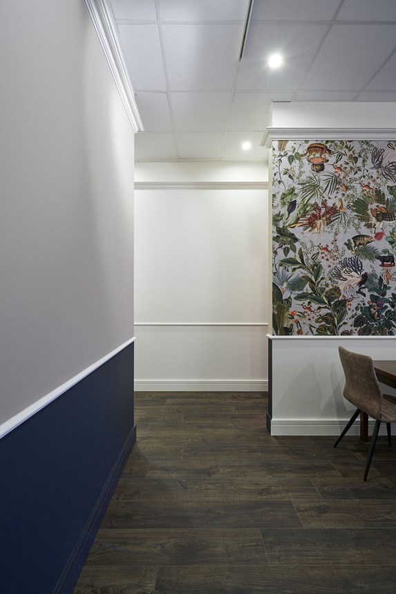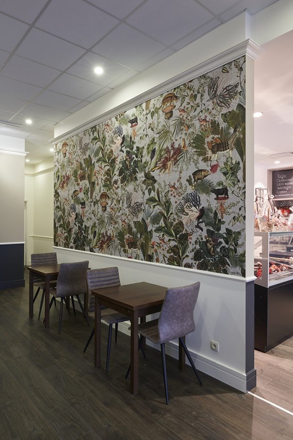 Frische Pastelltöne und natürliche Farben vervollständigen harmonisch den gewünschten traditionelleren Look. Verspielte Tapeten setzen neben den geschmackvollen Zierleisten charmante Akzente. Die lange, geradlinige Thekenfront, ein raumhohes Präsentationsregal und die außergewöhnlichen Pendelleuchten schaffen ein gemütliches und modernes Ambiente.
